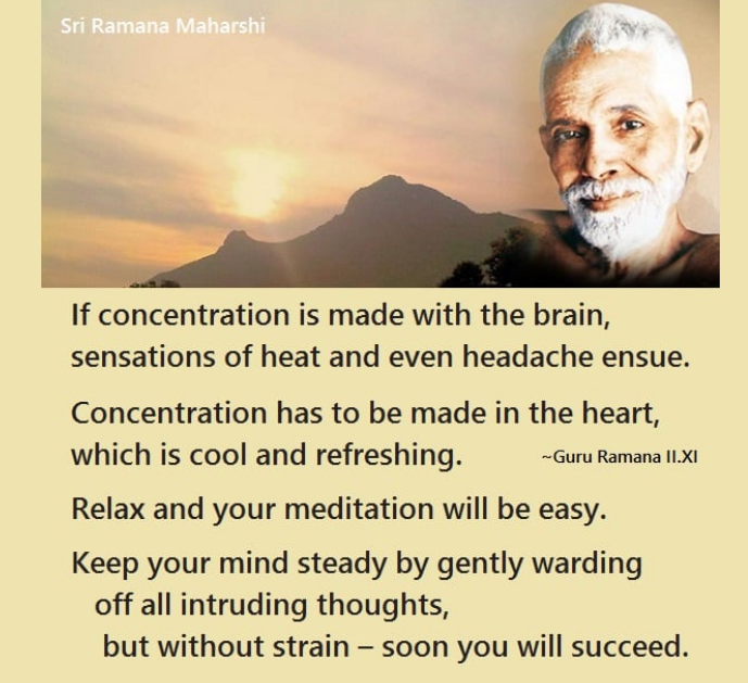 „Wird mit dem Gehirn konzentriert, treten Hitzegefühle und sogar Kopfschmerzen auf. Konzentration muss im Herzen erfolgen, das kühl und erfrischend ist. Entspannen Sie sich und Ihre Meditation wird einfach sein. Halten Sie Ihren Geist ruhig, indem Sie alle eindringenden Gedanken sanft abwehren – aber ohne Anstrengung – bald werden Sie Erfolg haben.“