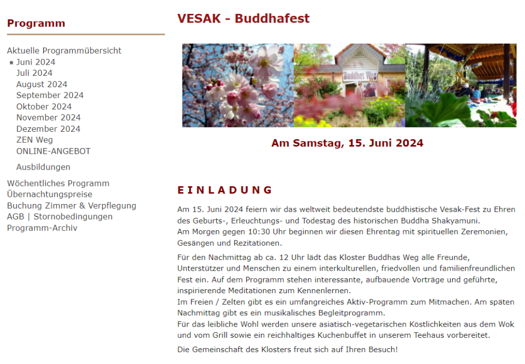Am Samstag, 15. Juni findet im Kloster und Seminarhaus Buddhas Weg in Wald-Michelbach von 10:30 – 20:00 Uhr das jährliche Vesak-Fest, das wichtigste Fest des Buddhismus zu Ehren des Buddha.